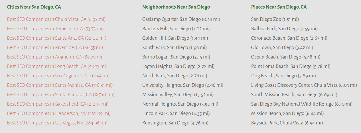 The general idea for providing interlinks between different pages is that Search Engines such as Google can crawl pages more easily. For example, when Google crawls a GEO Landing Page “San Diego”, it would then follow the links to “Chicago” and “Miami” since they would be listed on the same page.